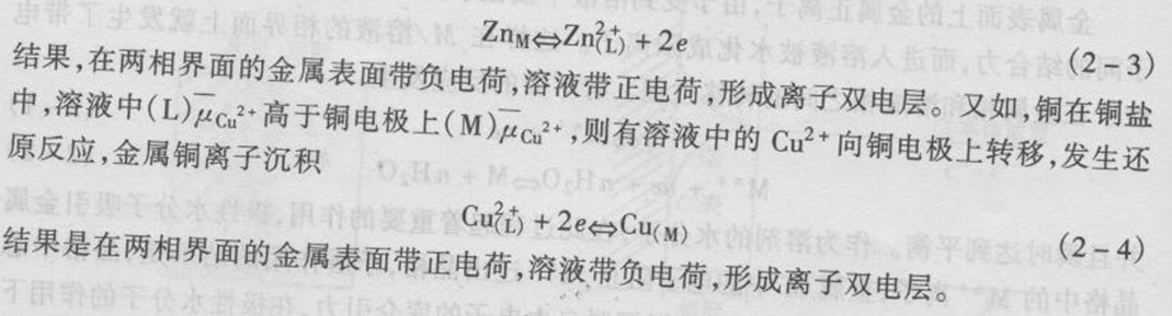 如圖25(6)所示。這類雙電層是由正電性金屬在含有正電性金屬離子的溶液中形成