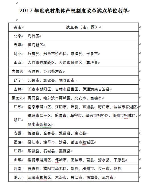 據(jù)農(nóng)業(yè)部消息,為貫徹落實(shí)《中共中央國務(wù)院關(guān)于穩(wěn)步推進(jìn)農(nóng)村集體產(chǎn)權(quán)制度改革的意見》精神,由點(diǎn)及面開展集體經(jīng)營性資產(chǎn)產(chǎn)權(quán)制度改革,經(jīng)各省、自治區(qū)、直轄市及計(jì)劃單列市推薦,農(nóng)業(yè)部、中央農(nóng)辦確定北京市海淀區(qū)等100個(gè)縣(市、區(qū))為2017年度農(nóng)村集體產(chǎn)權(quán)制度改革試點(diǎn)單位。西藏自治區(qū)曲水縣、新疆維吾爾自治區(qū)沙灣縣作為2015年確定的農(nóng)村集體資產(chǎn)股份權(quán)能改革試點(diǎn)縣,在完成好原有試點(diǎn)任務(wù)的基礎(chǔ)上,承擔(dān)新一輪改革試點(diǎn)任務(wù)。所有試點(diǎn)單位的試點(diǎn)時(shí)間到2018年底結(jié)束。