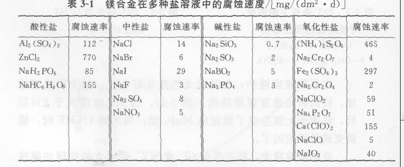 在鹽溶液中,鎂及其臺(tái)金的腐蝕行為比較復(fù)雜,主要取決于鹽的性質(zhì),各種鹽溶液中鎂合金的腐蝕速度列于表3-1。幾種典鎂合金在 %NaCl溶液中的腐蝕速度列于表-2。